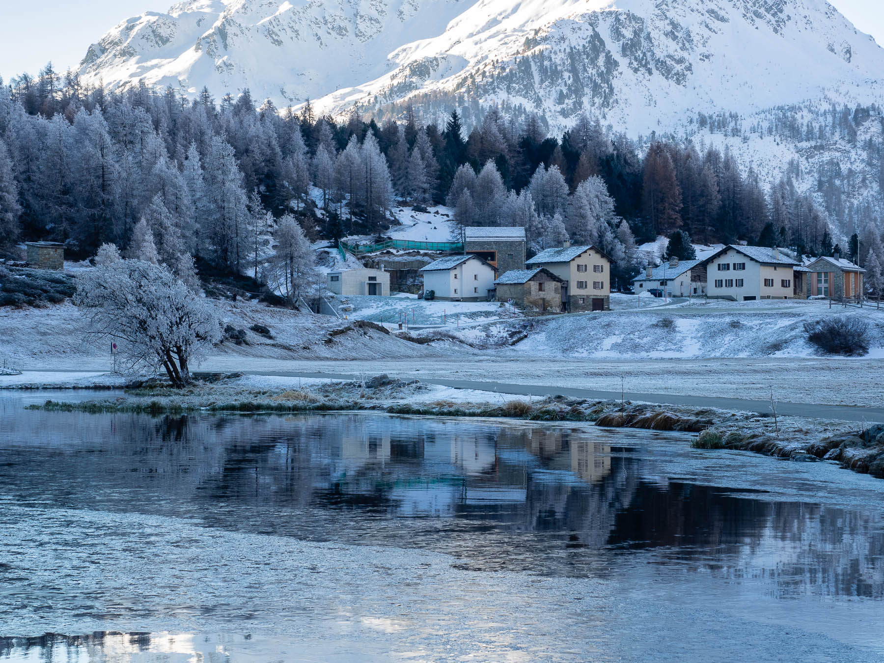 Uno scatto gradevole e ben composto, con qualche bianco al limite nella parte innevata al sole e una leggera dominante azzurra in quella in ombra che proverei ad attenuare ma non ad eliminare per mantenere il senso di freddo.
