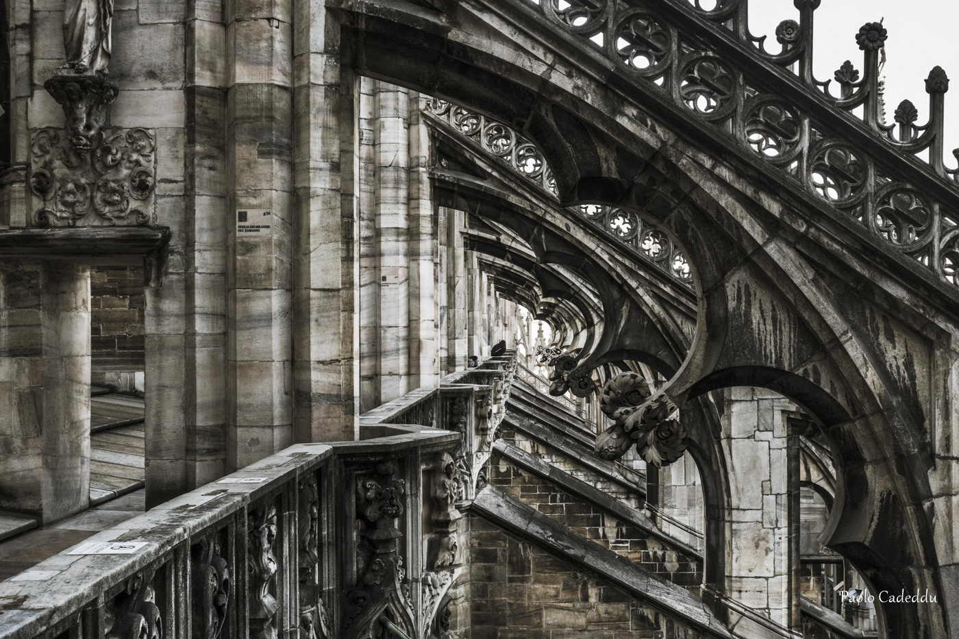 Una bella infilata di archi rampanti. Mi chiedevo se una ripresa verticale non ti avrebbe permesso di non tagliare la statua e di dare maggiore slancio alla verticalità della struttura gotica e degli stessi archi. Ciao  |