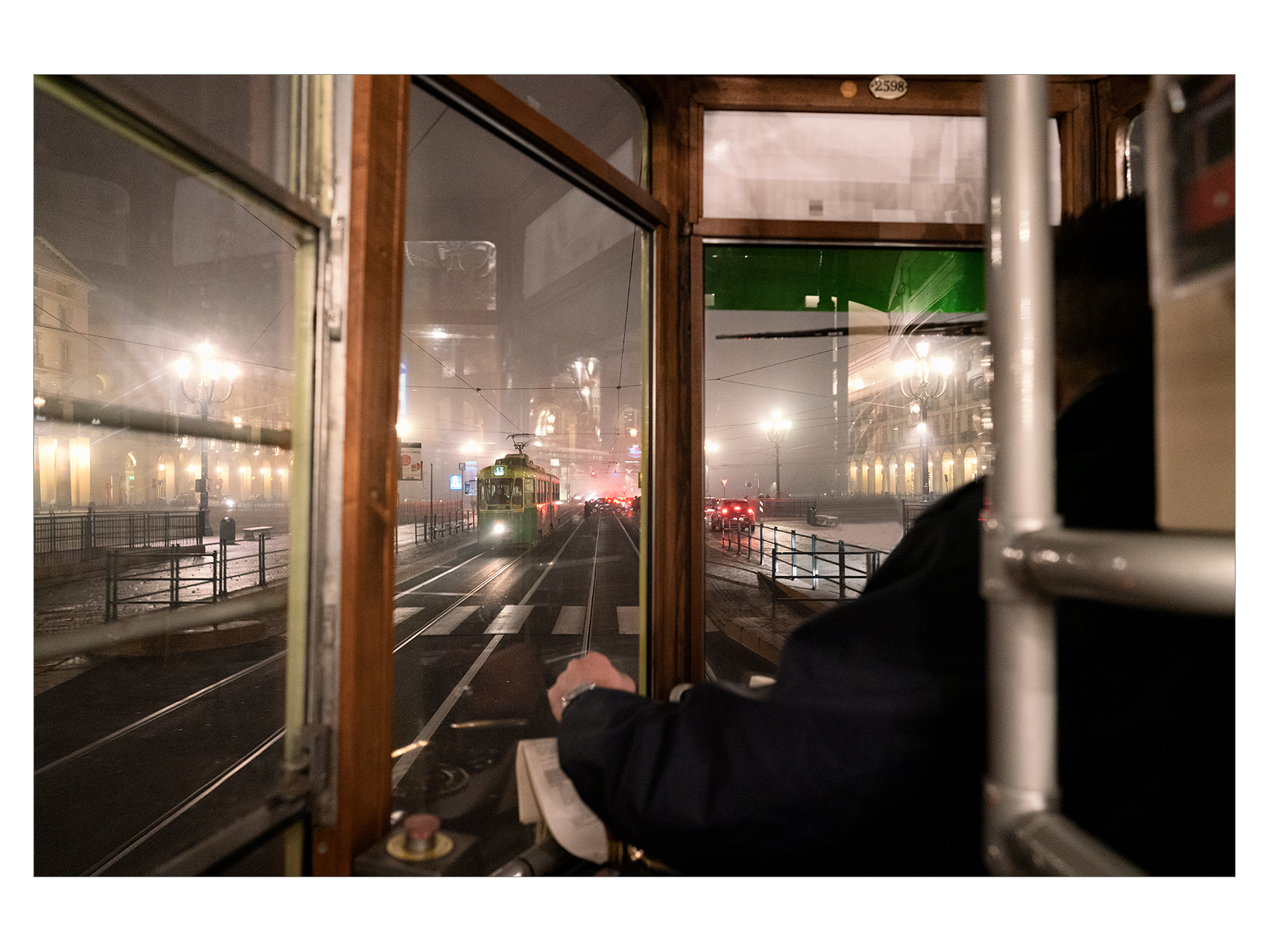 Molto bella: i colori, il punto di vista, la resa dell'atmosfera notturna metropolitana, la fuga dei binari, la mano del manovratore, l'altro tram in avvicinamento...