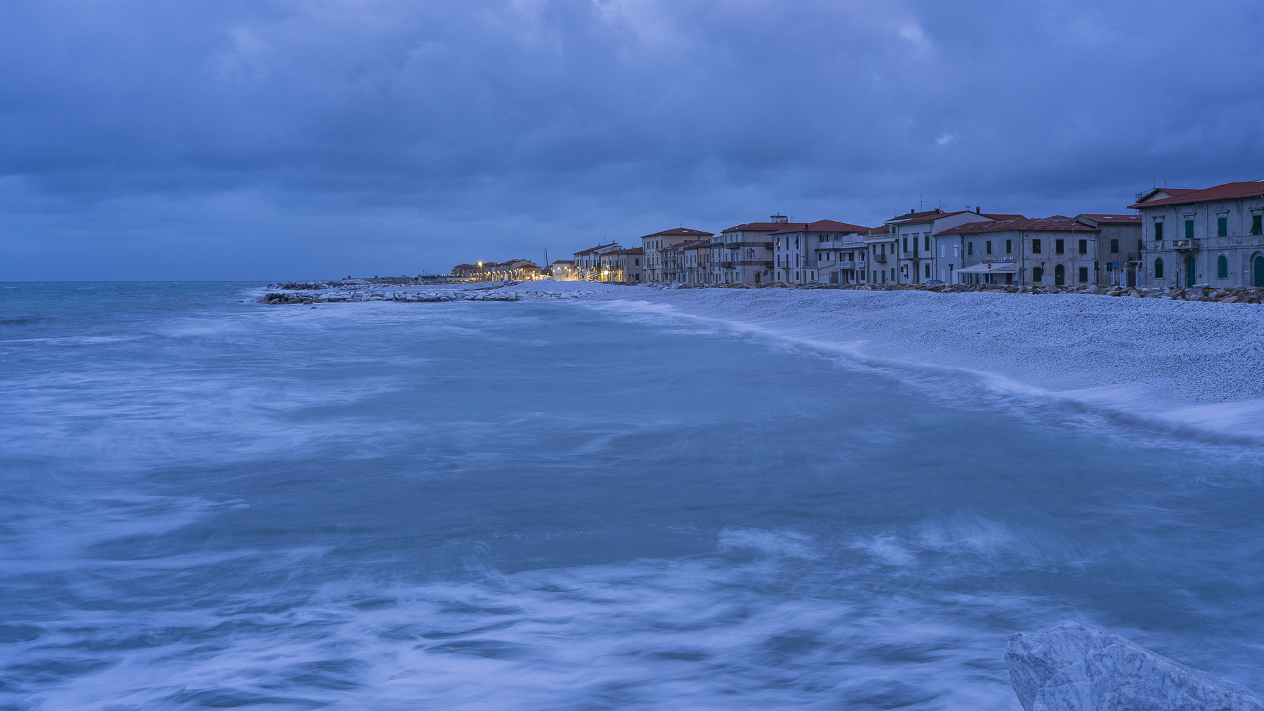 Tornando allo scatto mi piace la composizione, la passeggiata porta l'occhio in fondo a Marina (è Marina di Pisa vero?) illuminata, il mosso del mare lo trovo ben dosato, uno scatto piacevole e curato.