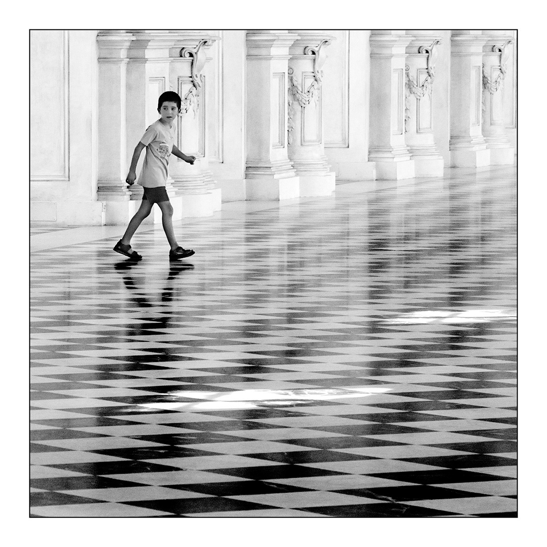| Piacevole composizione e ripresa..il bambino sta attraversando il pavimento in punta di piedi, forse per non sporcare..Piacevole il b/n.  Buona serata.   Arnaldo.