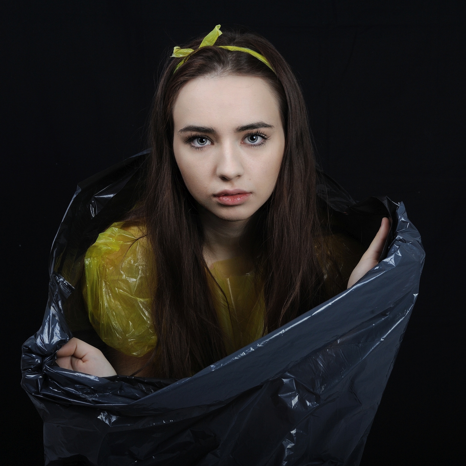 Questa foto faceva parte di una piccola serie dal titolo: così bella che staresti bene anche vestita con un sacco della spazzatura dove ci siamo divertiti a vestire Gabriela con sacchi di immondizia di vari colori. Quando la ragazza per scherzo si è infilata in un sacco nero e mi ha guardato con i suoi occhioni mi è venuta l'idea della bambola che non si usa più e si getta via ed ho voluto dare anima e corpo a questo gesto.