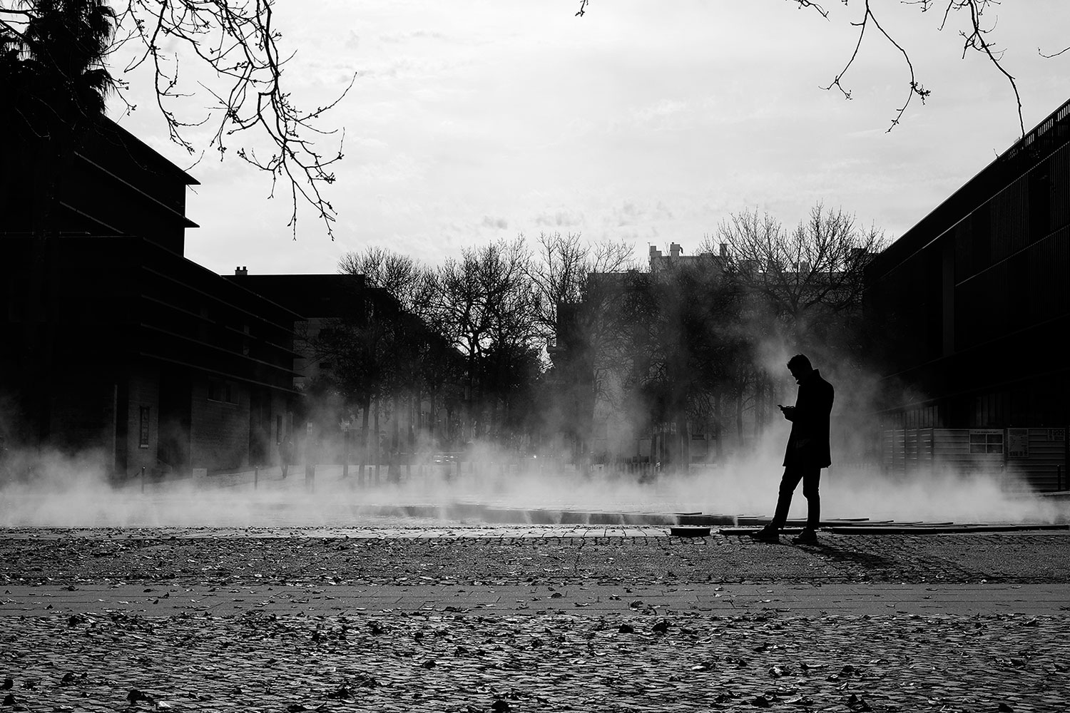 Foto interessante per la silhouette in controluce e per la presenza di questi vapori che esalano dal terreno.