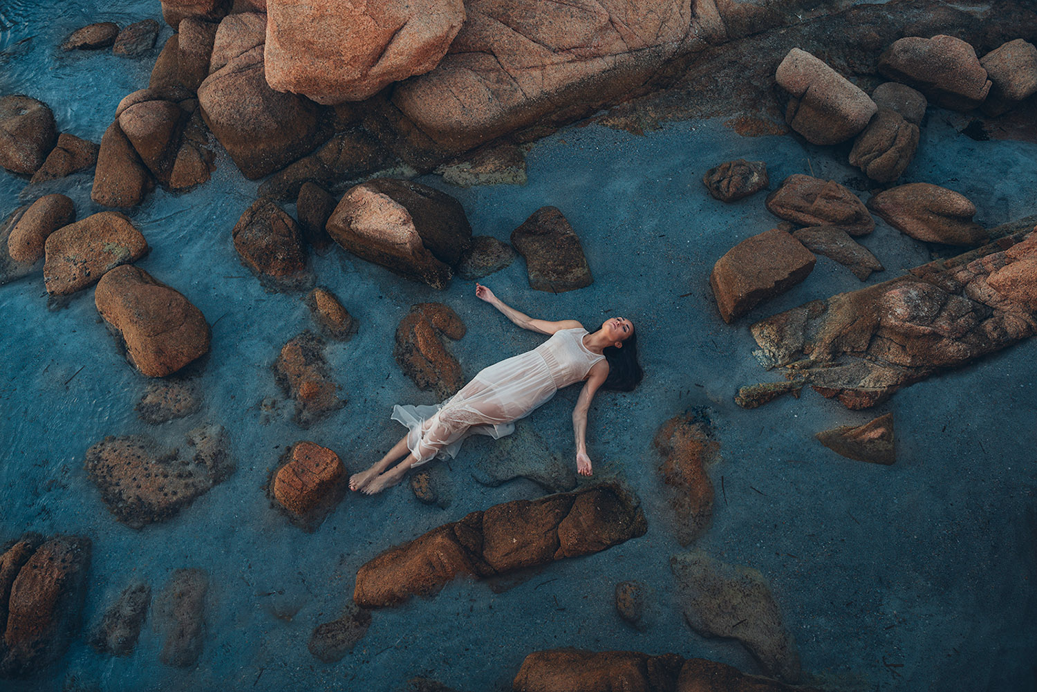 L'ambientazione è splendida: molti elementi presenti, ma concettualmente riconducibili solo a 2, le rocce e la particolare superficie turchese su cui poggiano (si immergono).
