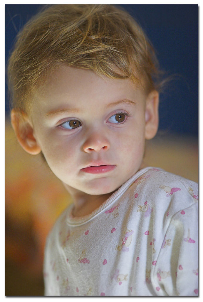 Questa foto mi piace moltissimo, hai saputo cogliere un'espressione stupenda e gestito molto bene la luce.. insomma: ottimo lavoro! Visto che il colore dello sfondo non è perfettamente uniforme potresti anche provare a renderla in B/N.. però si perderebbe il colore così delicato della pelle della bimba.. e non è poco . Insomma penso sia molto bella sia a colori che in B/N. Complimenti per lo scatto e per la bellissima bimba. Unico appunto: sei sicuro-sicuro di aver messo a fuoco gli occhi e non il nasino? E da ultimo: hai usato un 50/1.4 a tutta apertura o un mediotele? |