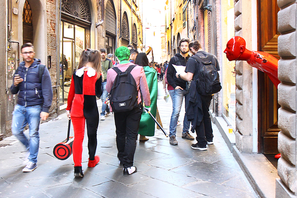 Il manichino funziona un pò con tutto: spia o tenta di leggere il foglio del primo gruppo; richiama cromie e spirito carnevalesco del secondo e attira pure l' attenzione del passante a sinistra !