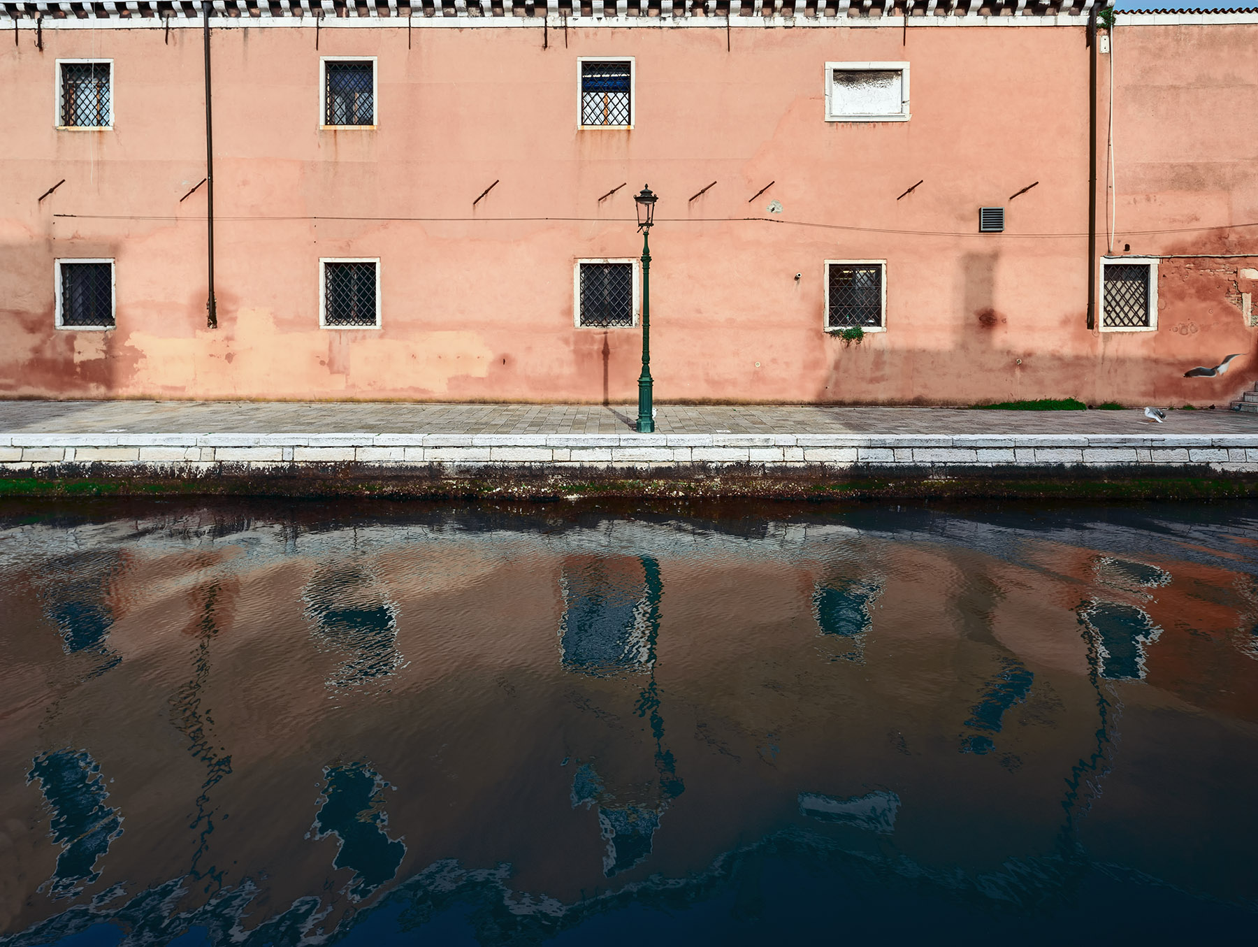 Bellissima la contrapposizione tra la concretezza ed immobilità dell’edificio e l’effimera immagine riflessa.
