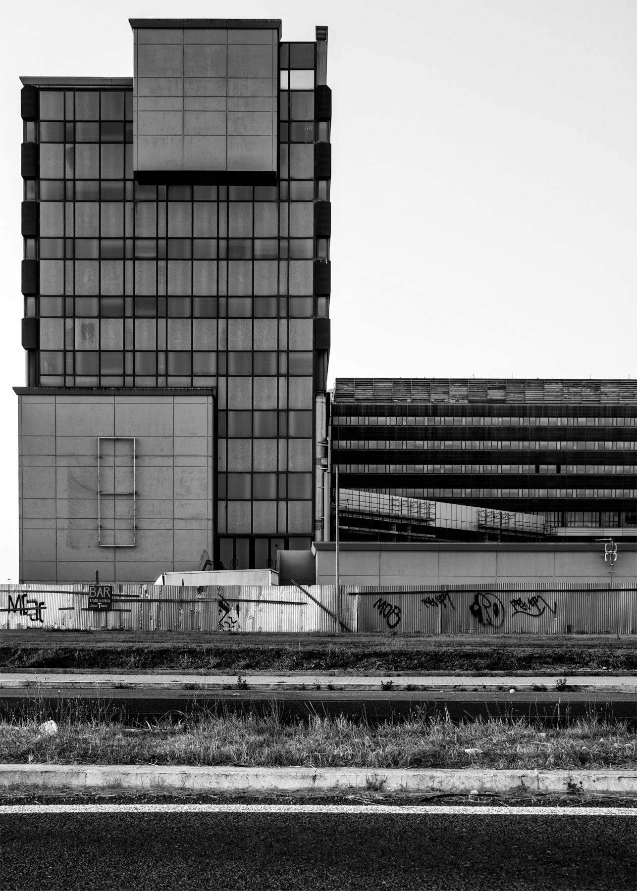 Quando mi capita di fare questo genere di fotografie mi trovo sempre in difficoltà: cosa metto? cosa non metto, e come lo metto? Questo perché questo genere di fotografia non descrive solo un paesaggio urbano, ma descrive anche uno stato d'animo, che può benissimo essere collettivo: qualcuno e qualcosa in quelle costruzioni avviene, sia pure di infima qualità; e diviene significativa la funzionalità, che in questo caso si traduce in estrema bruttezza. La desolazione è pertanto percepibile; io avrei sacrificato un po' di spazio a destra e in basso; Un po' più di cielo secondo me non avrebbe guastato.