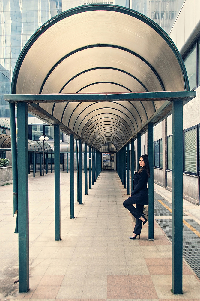 Per mio gusto un ottimo scatto, ben realizzato e frutto di una bella idea. Un tratto fashon inserito in un contesto architettonico/urbano. La copertura/tunnel dona profondità alla scena ed il soggetto femminile risalta per il suo essere in primo piano. Forse sarebbe stato ancora meglio se la ragazza fosse stata appoggiata al primo palo, ma è solo un’idea, non saprei. Trovo positivo l’uso di una completa pdc. Questo permette di avere piena consapevolezza dell’ambientazione e della sua conformazione intrigante. La pdc non toglie peso e centralità alla modella perché essa è l’unica figura umana nel fotogramma e risalta per la sua natura a fronte di elementi architettonici. Non in asse? Forse, ma non lo reputo un dettaglio fondamentale e capace di essere fastidioso perché il fulcro dell’immagine è altro.