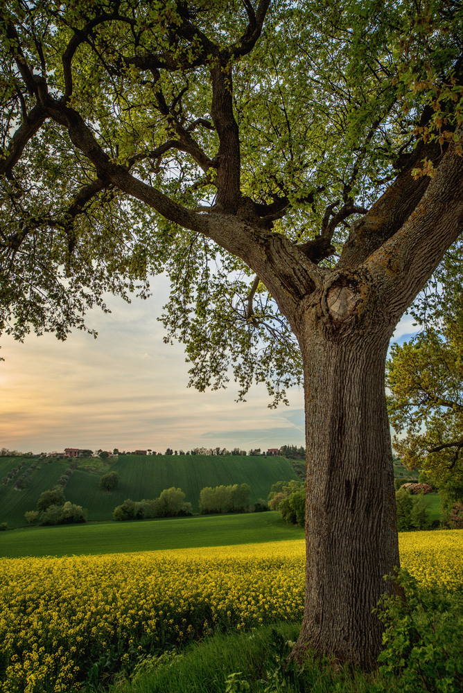 il grande albero introduce alla scena, campi gialli di colza si alternano a verdi prati fino alle colline sullo sfondo. Piace molto anche a me