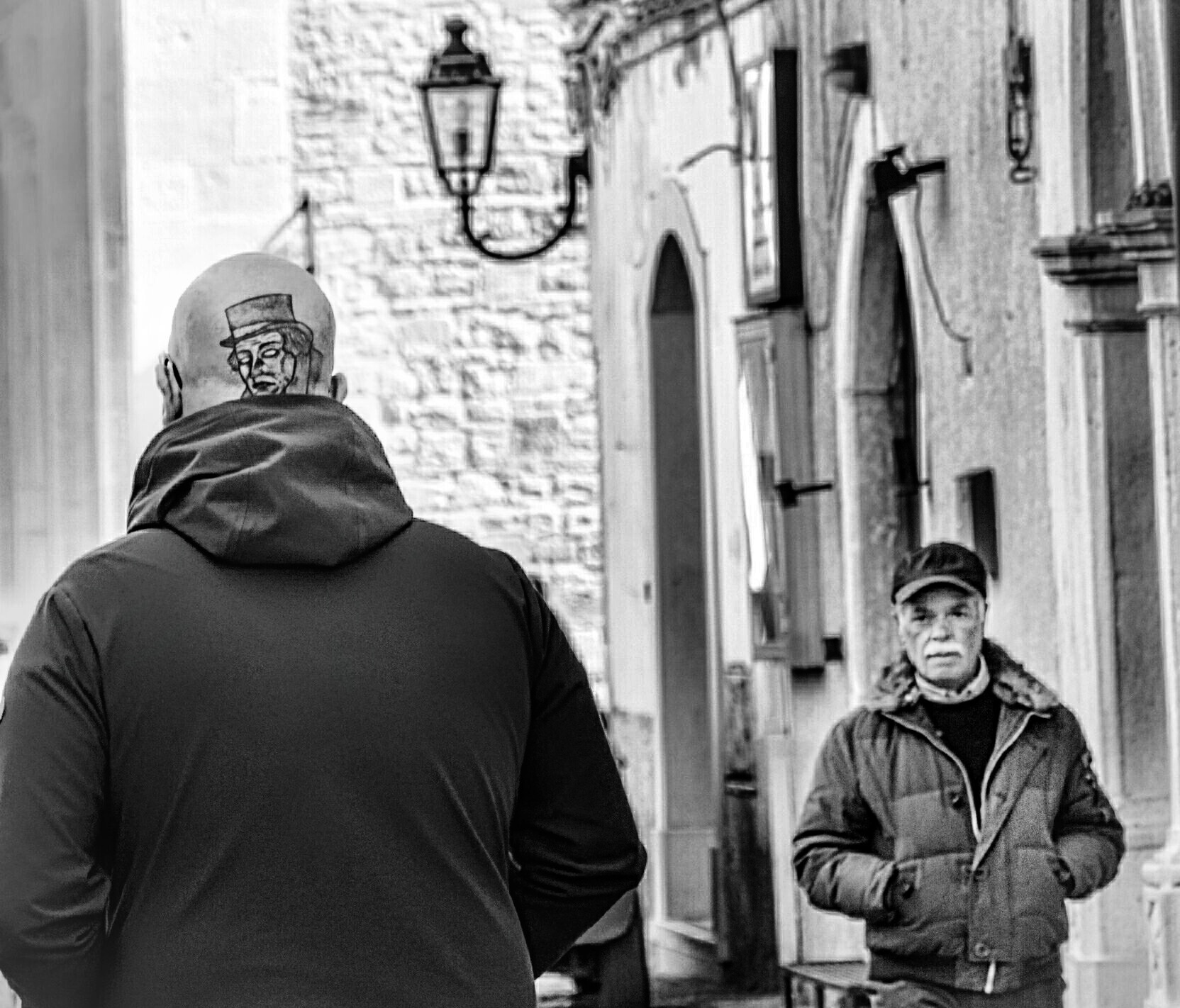D'accordo sulla mancanza di qualità, tuttavia mi sento di dirti che a me non dispiace l'idea in generale. C'è un gioco di rimandi interessante. Il signore baffuto osserva quello di spalle con sguardo straniato, ... siamo indotti a intuire ma non a comprendere la fonte di tale curiosità, grazie al tatuaggio sul collo.