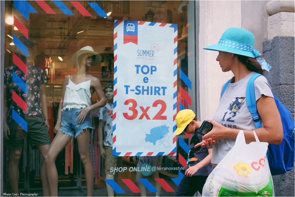 Il manichino nascosto risulta un po' penalizzato dalle strisce colorate applicate sulla vetrina: mi chiedo se un adeguato BN non possa aiutare nella lettura.