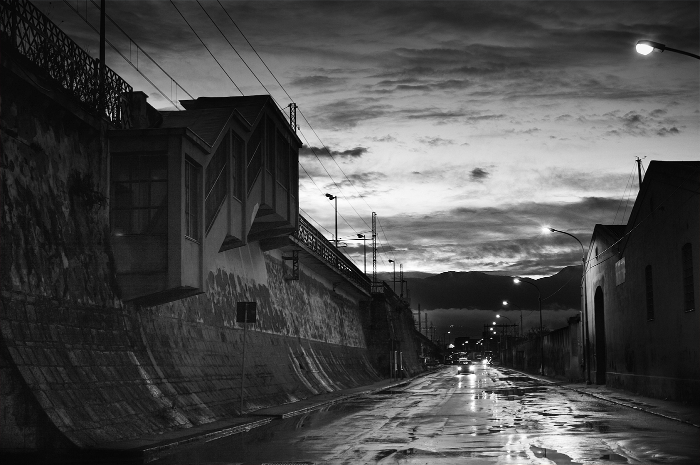 Bella l'ora di scatto con le luci dei fanali ancora accese ed il cielo che comincia a schiarire.Ottimo bn particolarmente apprezzato sulla strada bagnata.Immagine di grande suggestione.Complimenti! Ciao