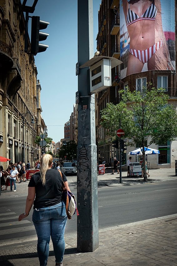 Non che ci sia poi moltissimo contrasto fra la sagoma della passante e quella sul manifesto... |