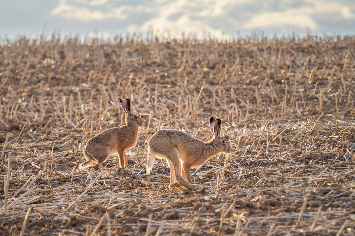 Le due lepri quasi in sequenza dinamica, e quella che già corre è perfetta. Bella anche la luce che le scontorna benissimo, pur lasciando evidente il mimetismo tra loro e lo sfondo. Bella… Ok! Ciao
