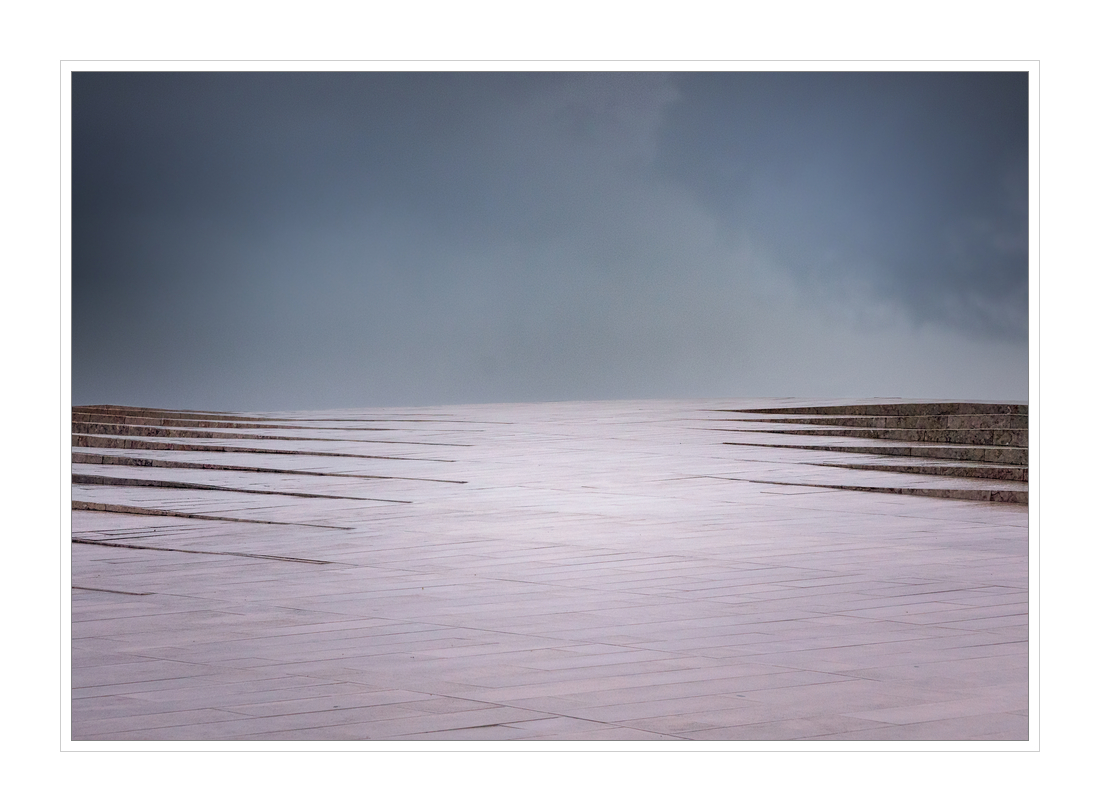 gradini che gradualmente scompaiono, mi piace molto oltre alla composizione il contrasto fra il rosato della pavimentazione e l'azzurro cupo del cielo.