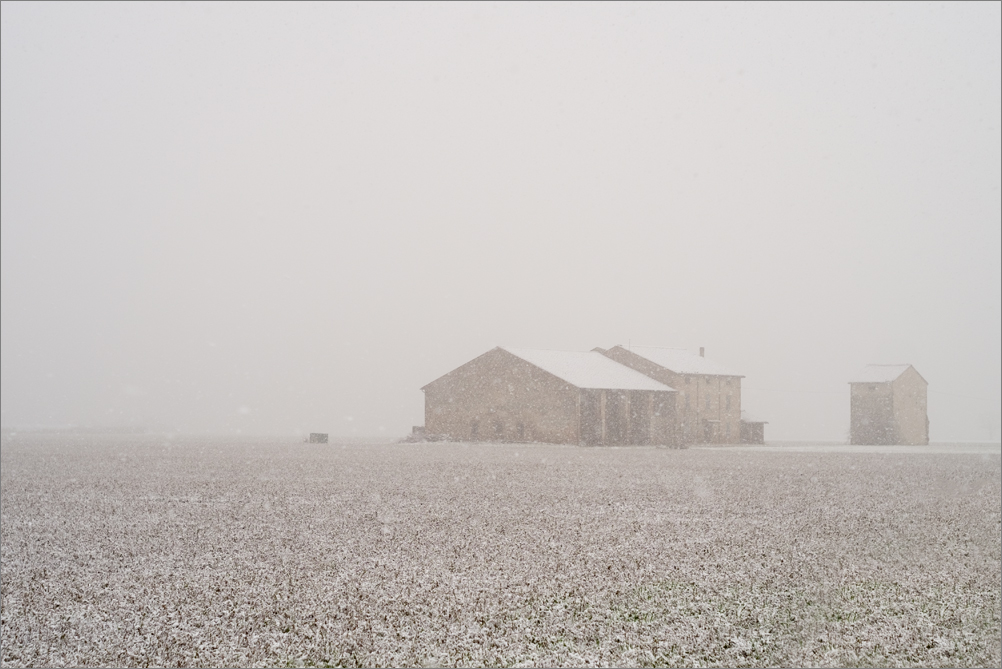 Immagine senza tempo, foschia freddo e neve. Tutto sembra sospeso in un'atmosfera rarefatta e quasi irreale. Si percepisce il silenzio delle nostre sterminate terre dove lo spazio vuoto è paesaggio ed ha un suo grande fascino. I pochi elementi emergono timidamente in queste distese di nulla.