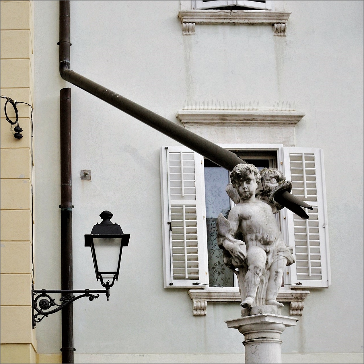 Grazie Franco per l'attenzione.Qui siamo a Pirano in Slovenia,una piazza dove un tempo forse si teneva il mercato.Ci sono quattro di questi putti su colonne ai quattro angoli,forse risalenti al periodo veneziano.Solo attraverso uno di questi è stato deciso di deviare la tubatura che prima scaricava in basso,forse l'acqua piovana creava problemi a qualche attività sottostante ma è comunque una situazione molto bizzarra.Pensa se deviassero una tubazione nella fontana di Trevi perchè lo scarico piovano infastidiva un bar! Ciao,Sergio. P.S. invio una veduta della piazza con il tubo deviato che si scorge sulla destra.