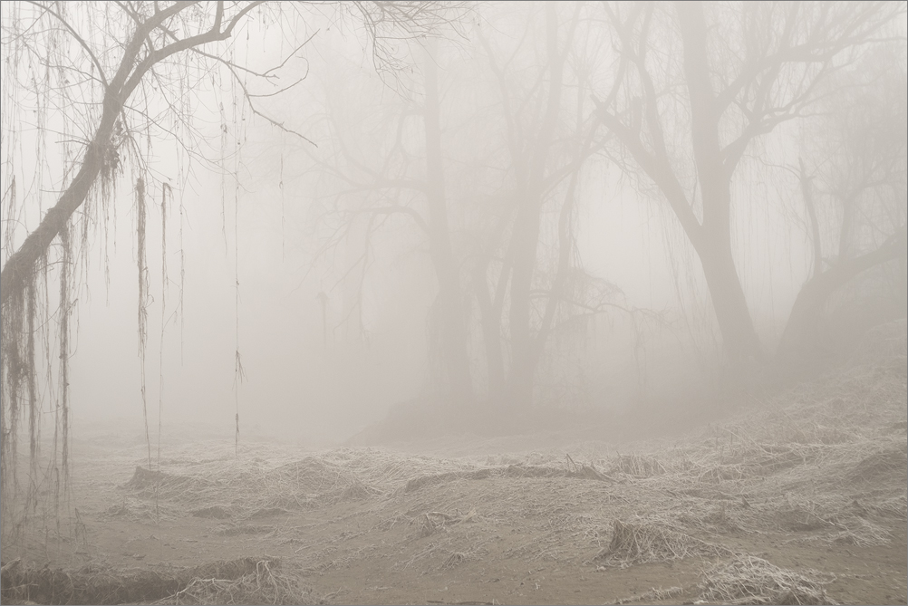 La nebbia cela e mostra al contempo in un gioco di vedo non vedo dove l'osservatore cerca invisibili particolari fra questi rami addormentati nel freddo dell'inverno.