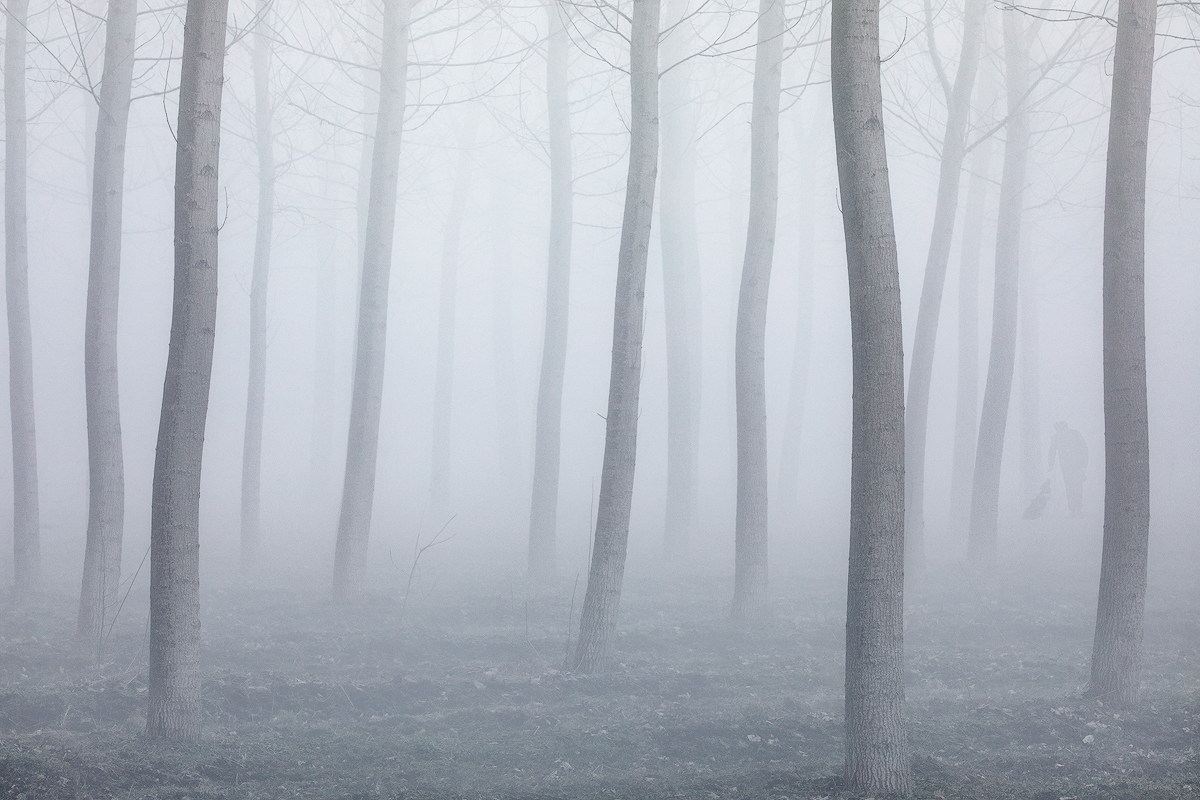 Un uomo ed il suo cane a passeggio nel pioppeto avvolto dalla foschia.