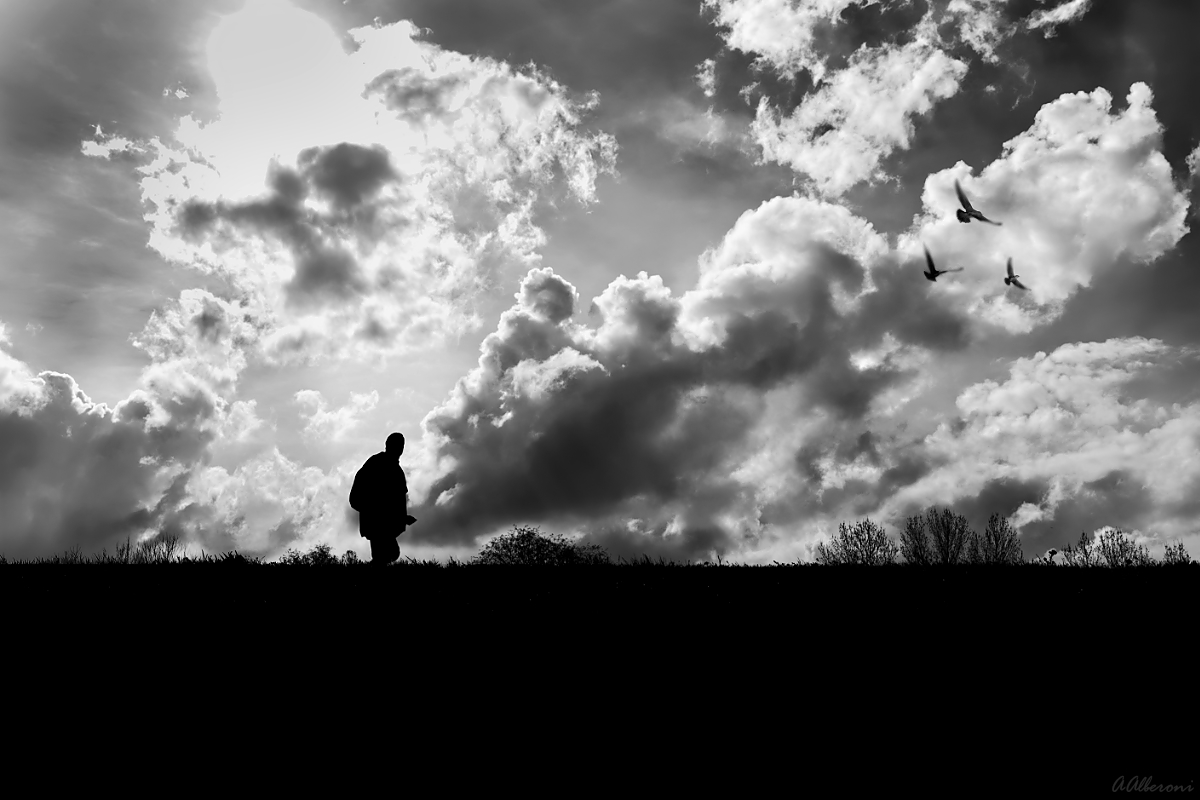 Bel controluce e b/n, il valore aggiunto a mio gusto sono i tre volatili, ben visibili grazie alla porzione di nube bianca alle loro spalle.