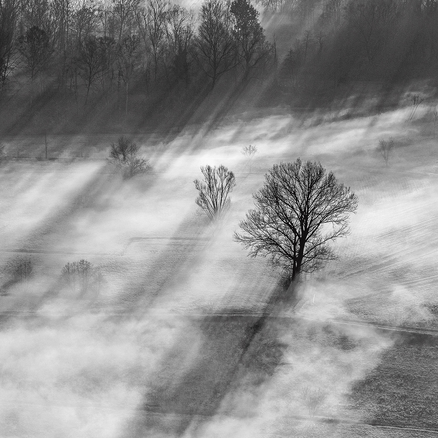 Sottili vibranti lame di luce si proiettano verso il bianco della nebbia animando un mondo surreale ...vero quanto fiabesco ...pura poesia per gli occhi....