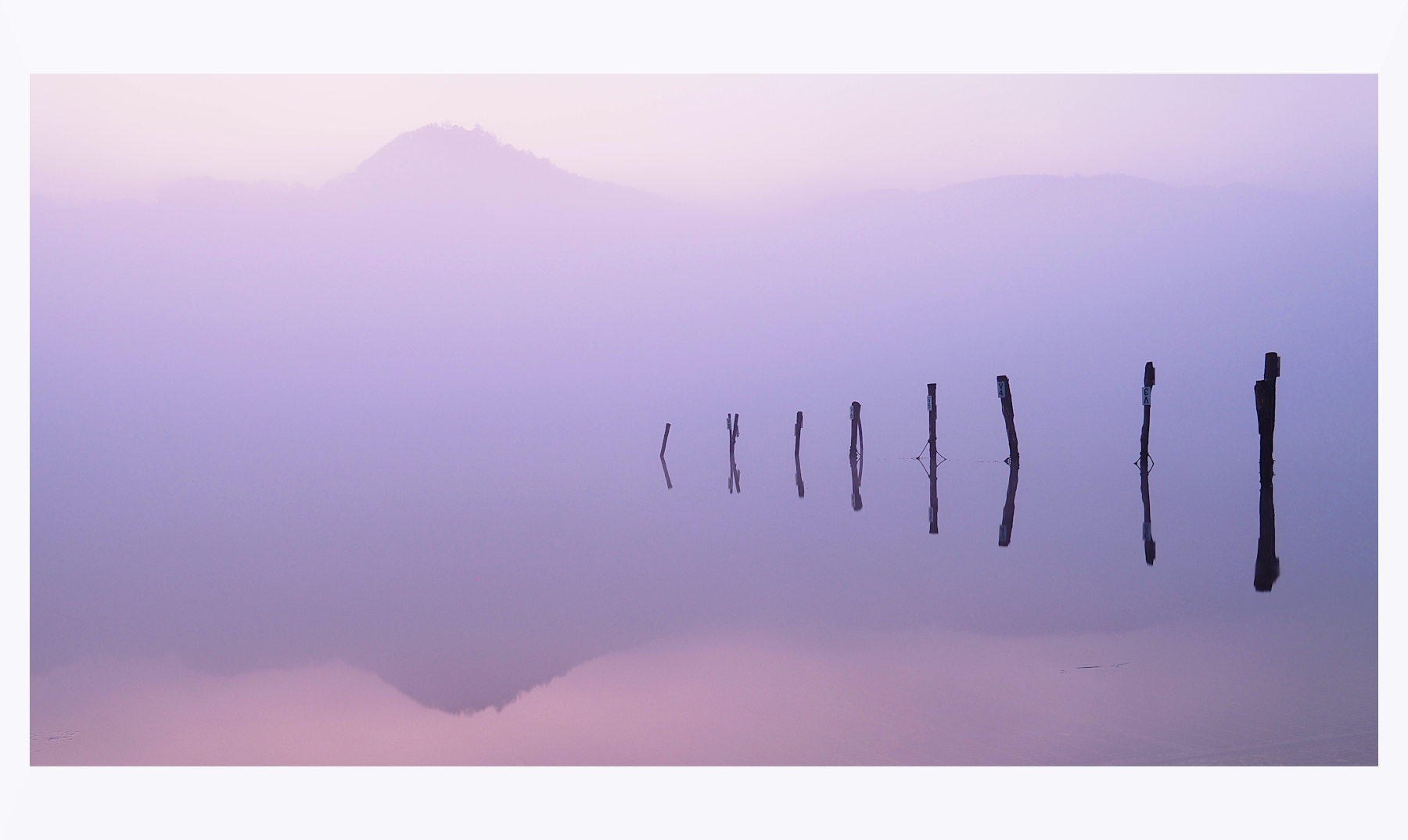 Nella contrapposizione netta e decisa, tra un paesaggio da sogno, poco definito, onirico, si stagliano netti questi pali, che dall'estremo destro, in una ripetizione, si addentrano nel fotogramma.