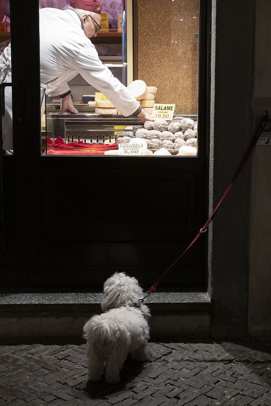 Non hai catturato soltanto un simpatico siparietto: mi piace la struttura della scena con le due diagonali che si incontrano, rappresentate dal braccio del salumiere ed il guinzaglio del cagnolino. A questo si aggiunge il richiamo cromatico bianco/rosso che tiene uniti ancor di più i due protagonisti tra il dentro ed il fuori.