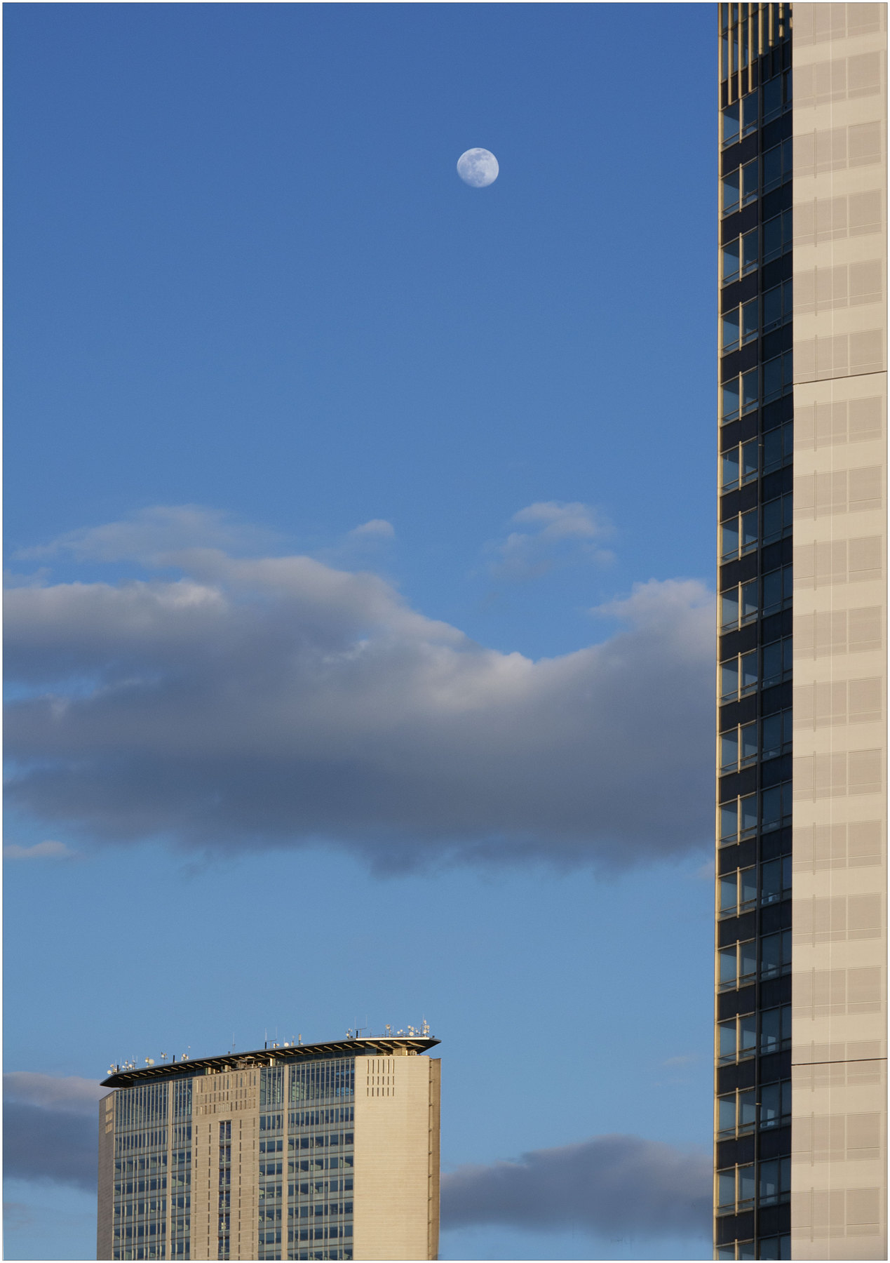 il rigore delle linee viene addolcito dalle nuvolette e dalla luna quasi piena, ottimo scatto per me