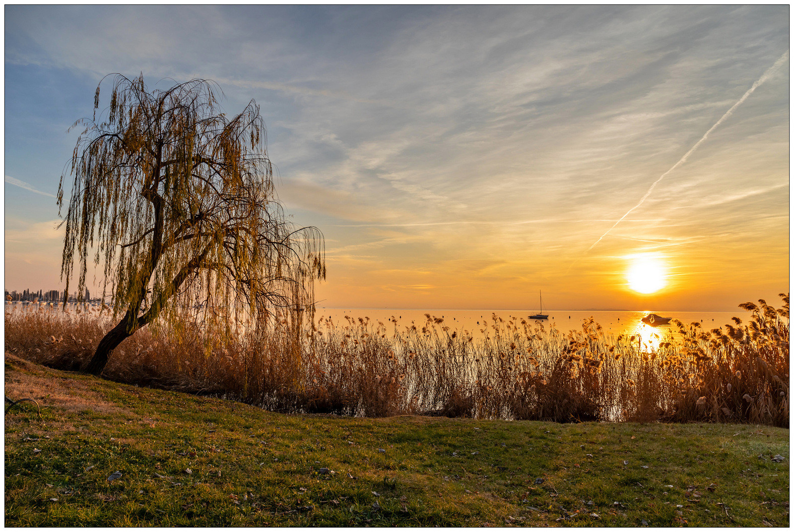 Piacevole per l'albero che sembra inchinarsi al sorgere (calare?) del sole, piacevole per il cielo, arricchito dalle scie.