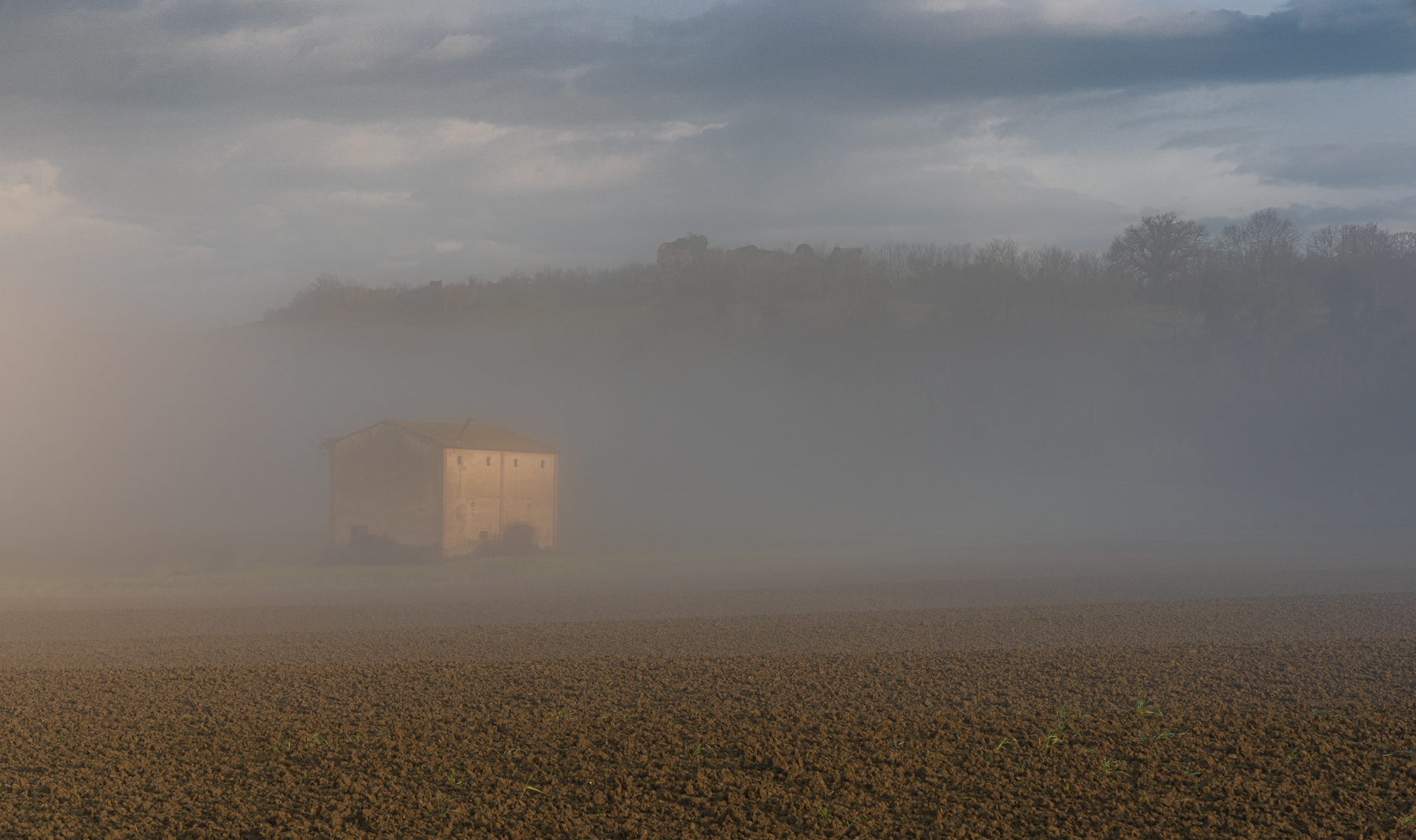 il leggero velo di nebbia lascia intravedere il casolare con i suoi tenui colori, un'immagine densa di atmosfera