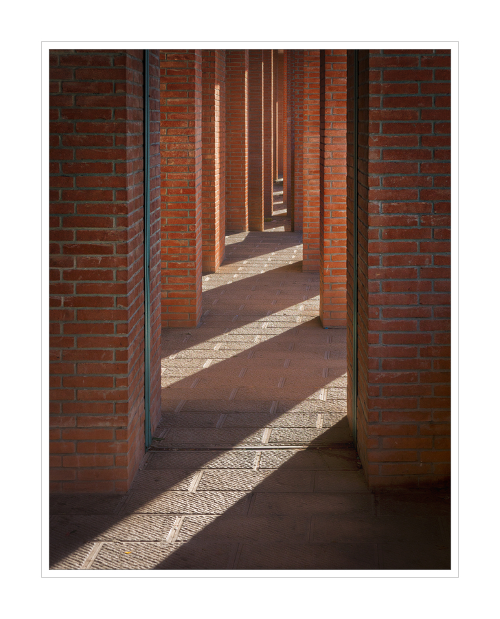 Secondo me il bn la identifica chiaramente come foto a valenza architettonica. Ma non mi pare fosse questa la chiave di lettura che voleva dare l'autore con il titolo " bosco di mattoni" laddove il colore arancionato delle colonne e la loro densità richiamano chiaramente i tronchi di alberi fittamente addensati. Questo per dire che preferisco nettamente la versione a colori