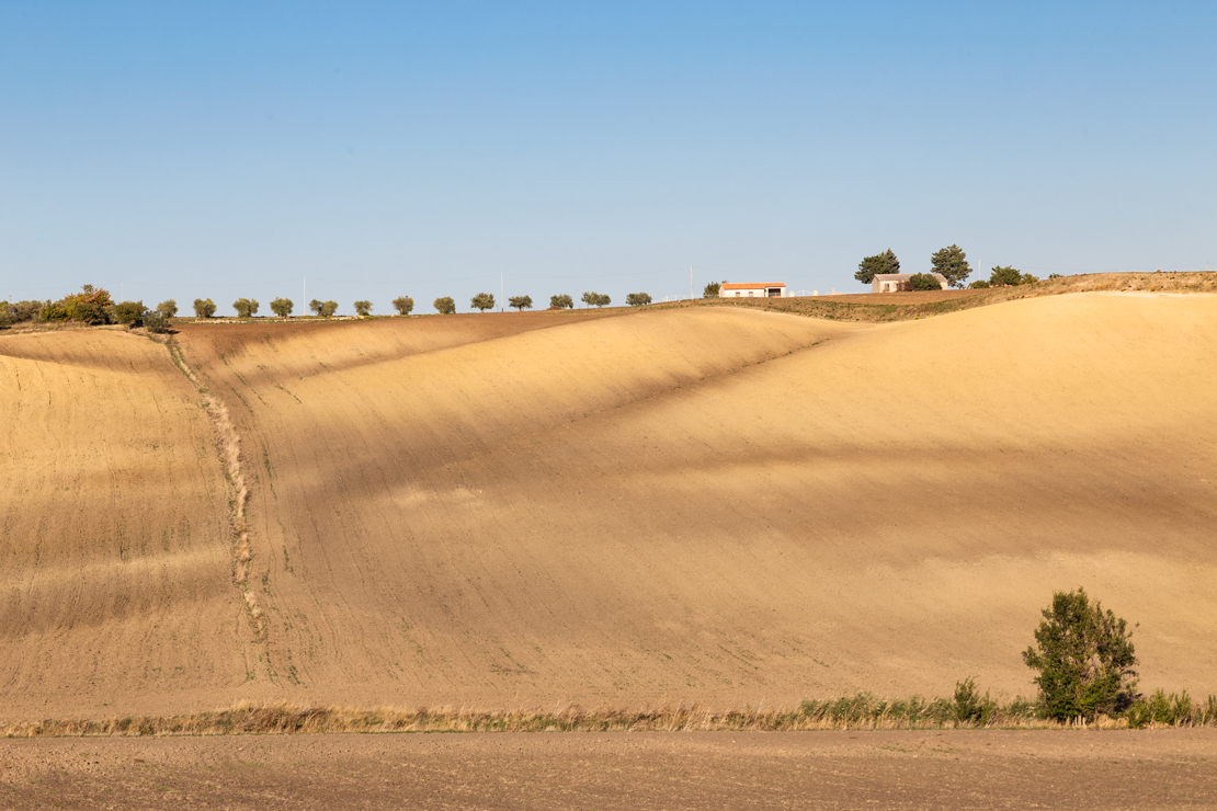 Linee orizzontali che si richiamano (alberi - cespugli in primo piano) e un campo ondulato, bella scena. Forse lavorando con luci/ombre e contrasto puoi dare piu' forza allo scatto.