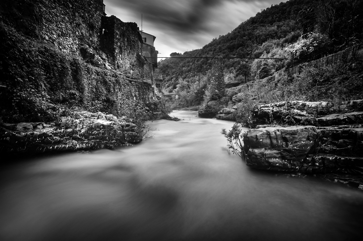 Il risultato è un bn piuttosto piatto e privo di sviluppo al centro (in zona rudere sulla destra del corso d'acqua e vegetazione sullo sfondo, per capirci) e un contrasto al limite del grafico sulla parete di sinistra e le rocce sulla destra.