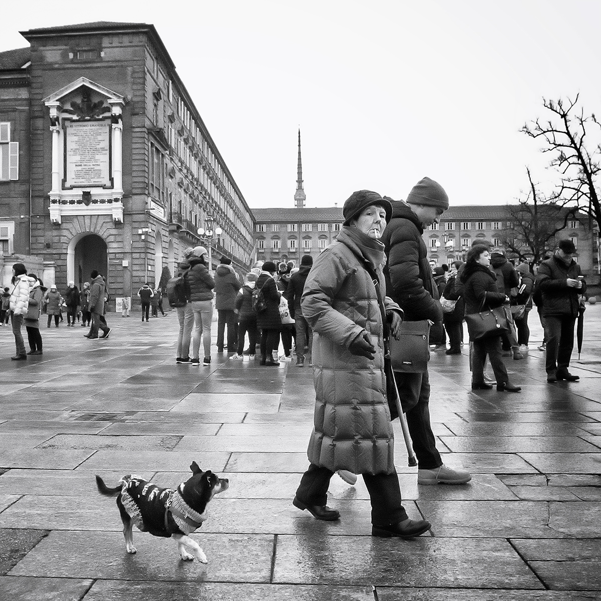 * Qui siamo a Torino in P.zza Castello una mattina uggiosa di Febbraio 2019 in occasione della cerimonia commemorativa degli Alpini sulla campagna di Russia con relativa mostra allestita nel Palazzo della Regione. La confusione di gente era notevole e la signora (non più giovanissima) con cagnetto ed accompagnatore è transitata con il suo cappottino rosso tutta spedita, fumando a tutto "vapore"...