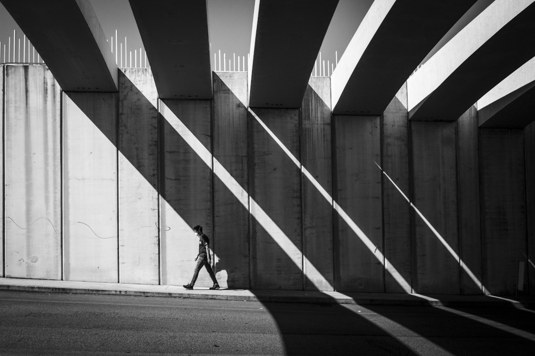Mi piace per le belle ombre decise e la composizione assai curata. Notevole ed interessante la presenza umana. Capisco perché hai scelto la prima, l'ombra sembra quasi "tagliare" testa e schiena che sono peraltro inclinate con il suo stesso angolo. Tuttavia trovo la seconda più pulita graficamente