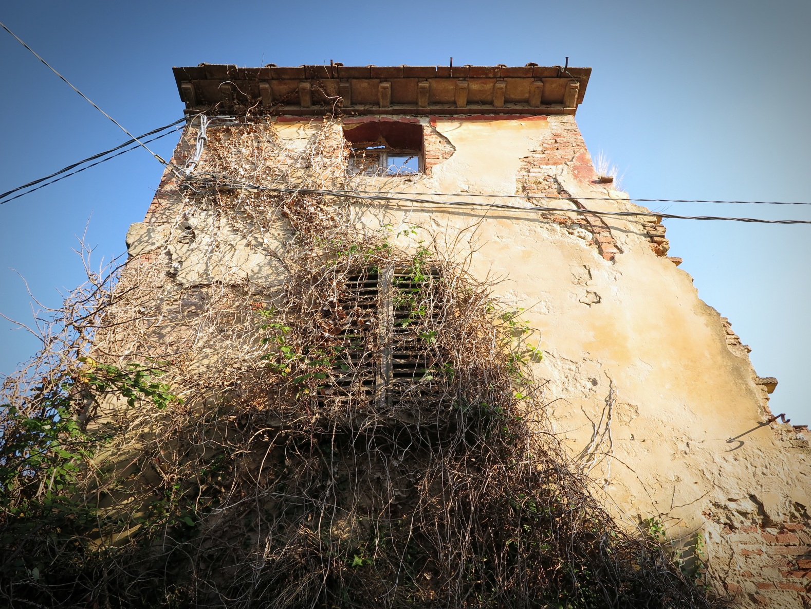 Ripresa dal basso sempre ostica, forse si poteva ancora tirar su l'edificio quasi fino al limite del frame. I cavi sembrano sorreggere questo vecchio rudere.