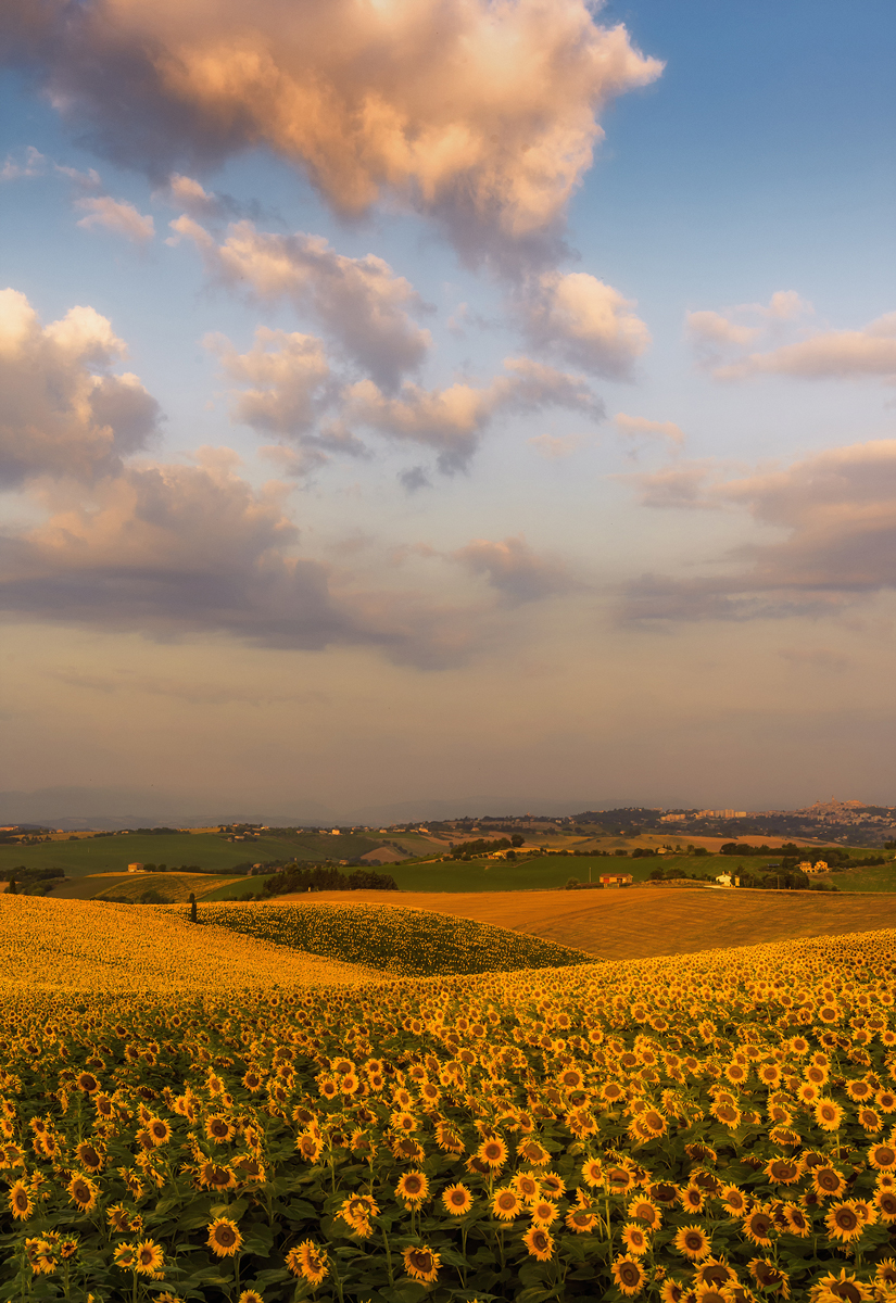 Mi piace moltissimo! In particolare apprezzo l' infinità dei girasoli, le linee create dai campi in primo piano e la ripresa dei colori caldi nel cielo e in particolare nella nuvola in alto.