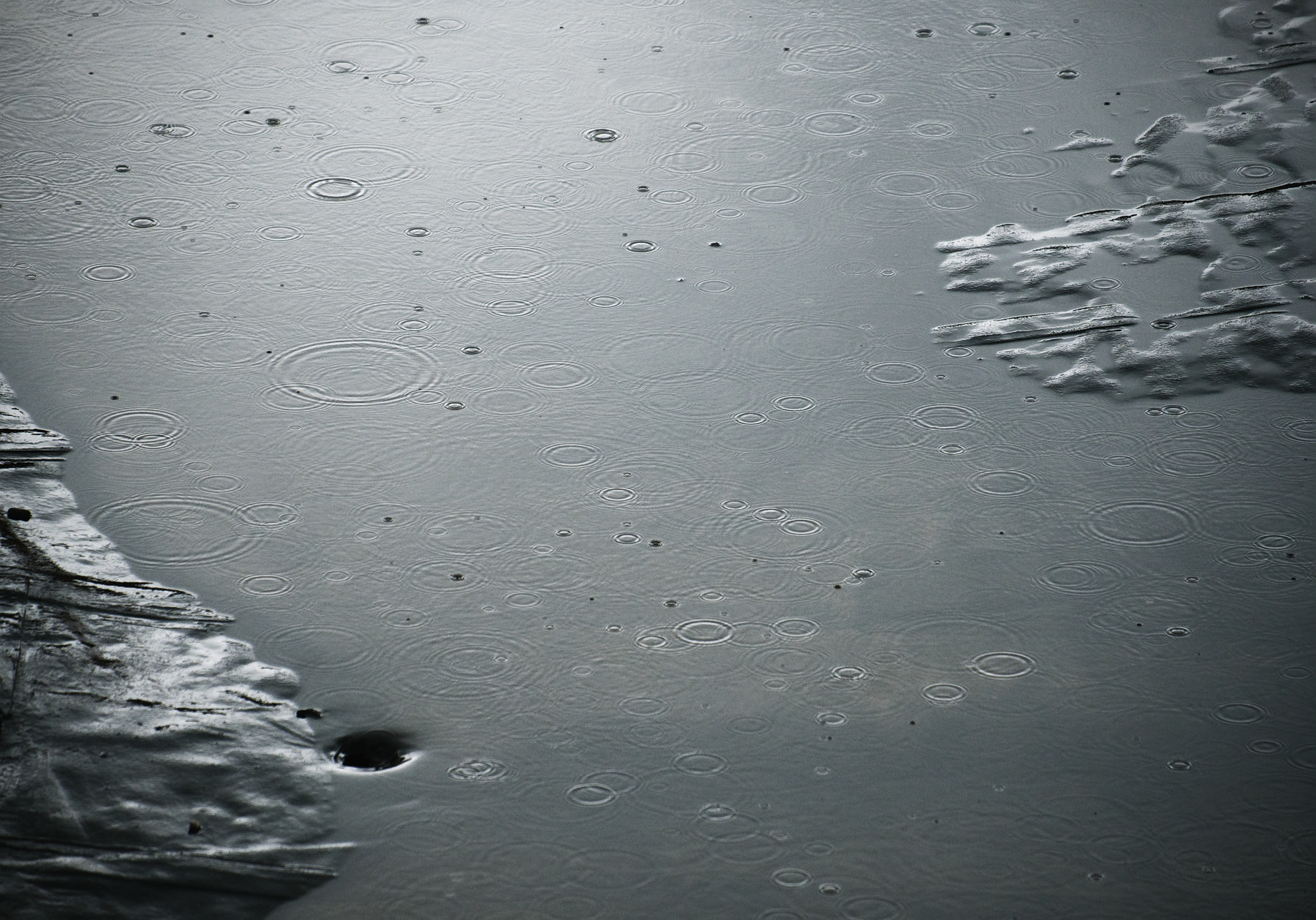 Bella. Le gocce di pioggia hanno disegnato innumerevoli cerchi perfetti nell'acqua immobile. Questa è una di quelle foto che mostrano la superiorità del B&N sul colore.