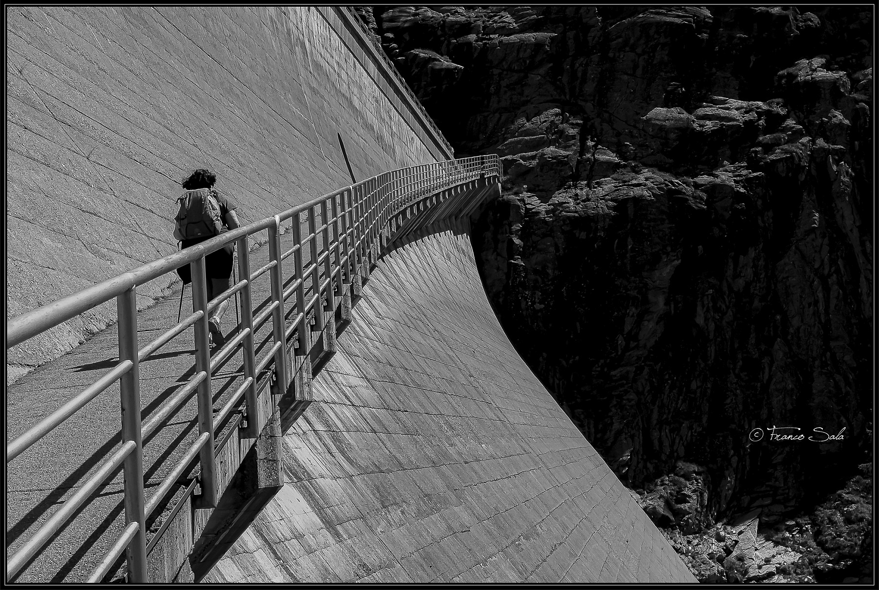 Suggestiva. Bella la suddivisione diagonale tra diga-chiaro e roccia-scuro e nitidissimo il bn.