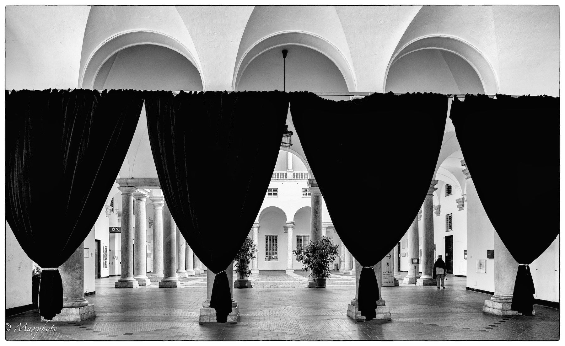 Senza dubbio una fotografia d’effetto. Ben fatta e con tutti i puntini sulle i. Nel senso che i connotati d’effetto di una scena del genere vengono messi in evidenza nel risultato finale. prima di tutto vedo che salienti nella scena sono la presenza di una struttura architettonica bianca a fronte di teli neri. Intelligentemente è stato scelto il B&N che togli lembi di colore non utili alla scena e rimarca e rafforza solo il contrasto/presenza di elementi scurissimi su uno sfondo bianco e chiaro. Niente fronzoli e solo quelllo che serve e ci vuole. l’uso di un grandangolo su FF poi consente un’estesa pdc che rende perfettamente leggibili tutti gli elementi dal primo piano allo sfondo. Ne scaturisce un’immagine dove vi è quasi un effetto ottico che rende la scena divisa in due (come fossero parti a sé stanti) nella parte superiore con i tre archi bianchi contrapposti alla parte apicale dei tendoni neri. Insomma per me una foto da 9.5….sarebbe stata da 10 senza la presenza di quella persona…