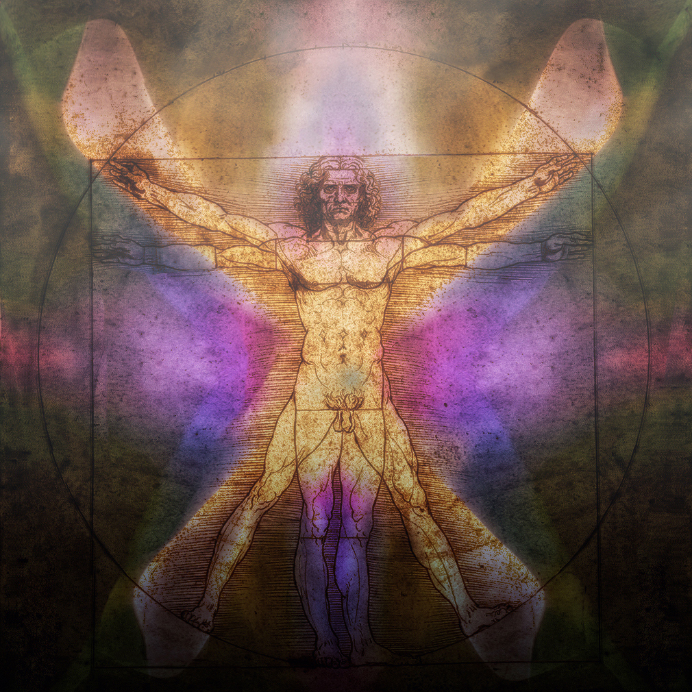 | Ho rivisitato il disegno di Leonardo da Vinci , in cui l' uomo è confinato in angusti simboli, il cerchio (simbolo della perfezione divina) ed il quadrato (simbolo della terra) .....che lo imprigionano nel loro interno. In un universo (multiverso) in continua evoluzione, l' essere umano può essere racchiuso in simboli limitanti che lo confinano, separandolo da ciò che è fuori dal simbolo ? Ho aggiunto le “ali della “trascendenza ”, per un possibile “”volo” nella sovracoscienza , fuori dagli schemi simbolici e dal loro significato. |