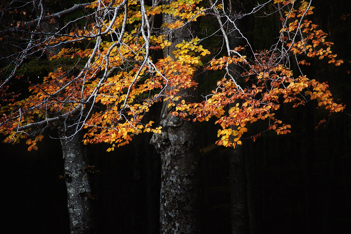 Anche a me piace moltissimo il contrasto cromatico trai colori caldi delle foglie (che attenuano la durezza del legno di rami e tronchi) ed il buio a sfondo. Bella proposta. Bravo.