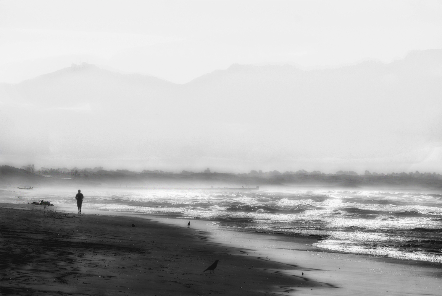 Dopo la mareggiata… tanti elementi… la persona che cammina, gli uccelli sparsi, i rami portati dal mare, la nebbia sullo sfondo, le onde ormai placate ma ancora vivide… tanti fattori indipendenti che ben si fondono in un’immagine d’atmosfera.
