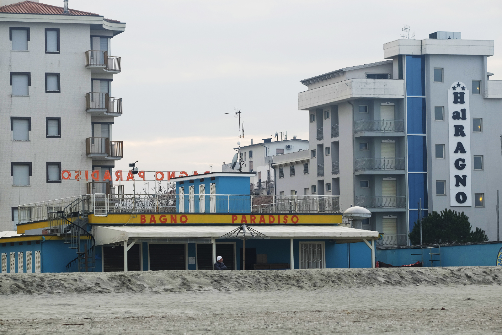 Scossa di rosso in uno spento contesto bigio-azzurrino.