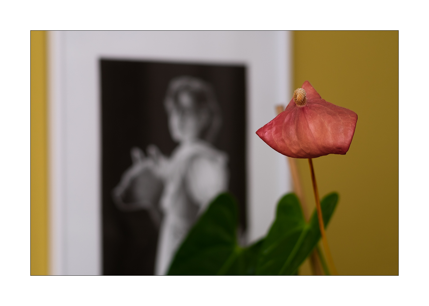 | Lo sfocato leggibile crea un evidente richiamo con il titolo. Invece, la posizione del fiore indeciso tra la parete e il quadro retrostante, quello stelo che taglia la foglia e le foglie stesse che interrompono la lettura dello sfondo a mio avviso potevano essere curate diversamente. Ciao 🤗 |