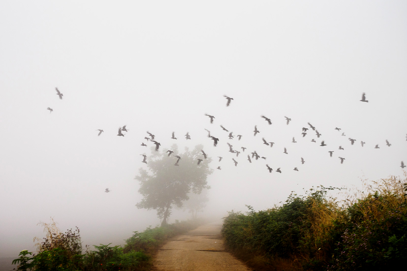 La nebbia, la strada che vi si perde, il volo nero e sfilacciato, i colori di terra bruciata ... tutto concorre armonicamente a questa sinfonia d'autunno.