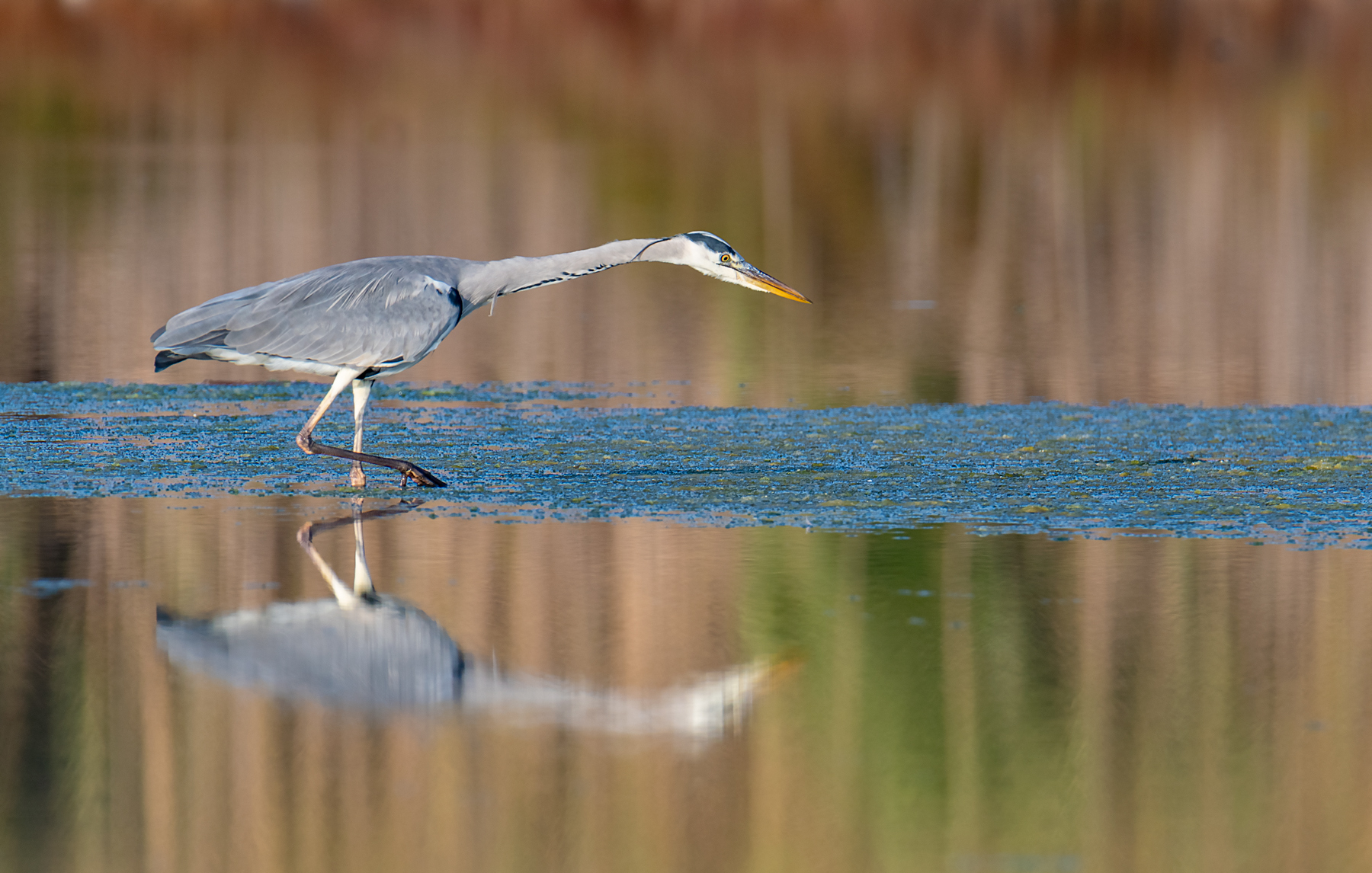 Posa caratteristica dell'airone a caccia...maf buona, bene il riflesso e i colori dello sfondo...quel blu elettrico non mi convince.