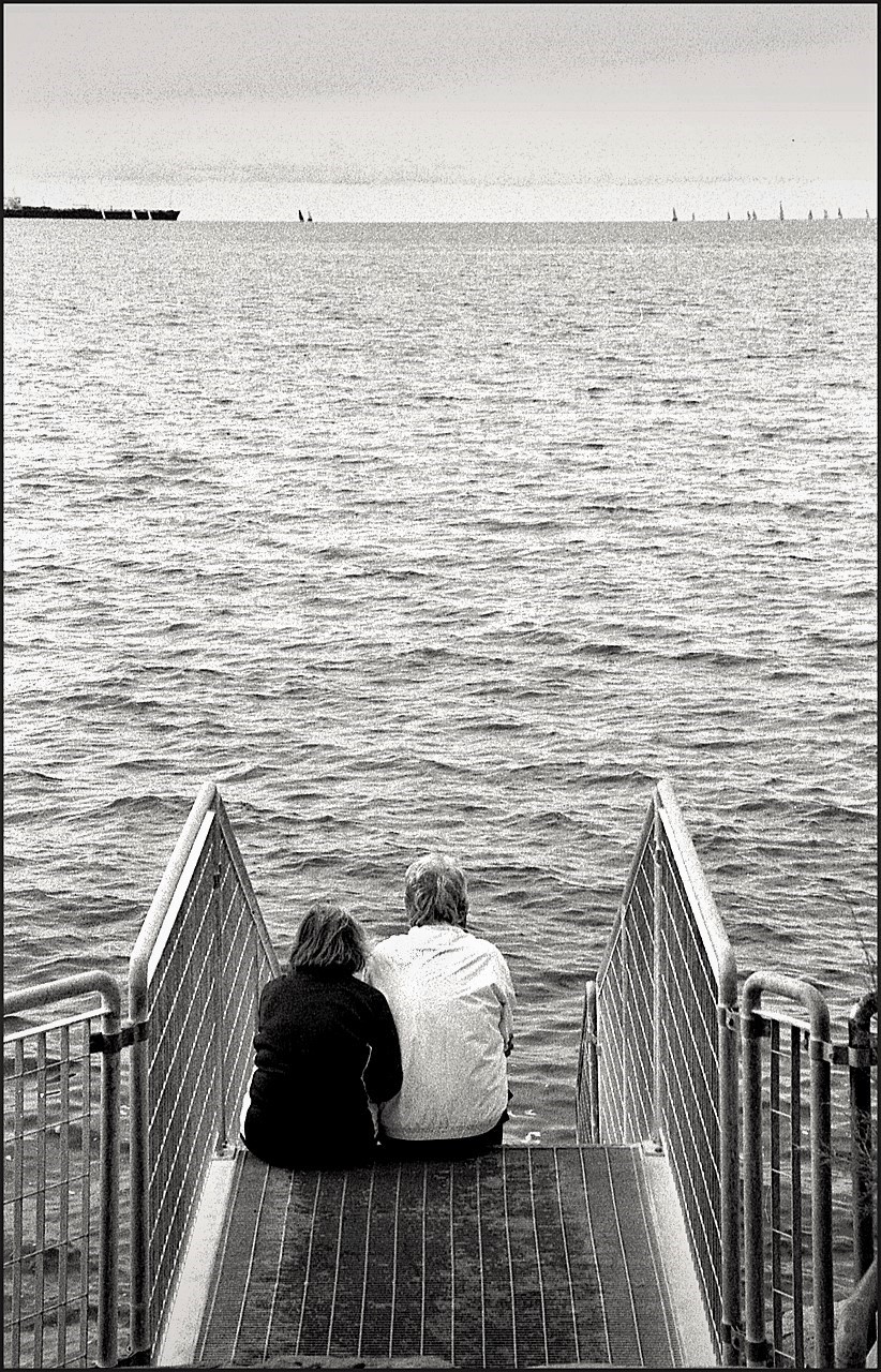 Un’immagine che combina l’intimità e l’intensità del momento con una composizione precisa e attenta, con il pontile, il mare e lo sfondo posizionati in modo ordinato e bilanciato, in un ottimo bn. Bravissimo!