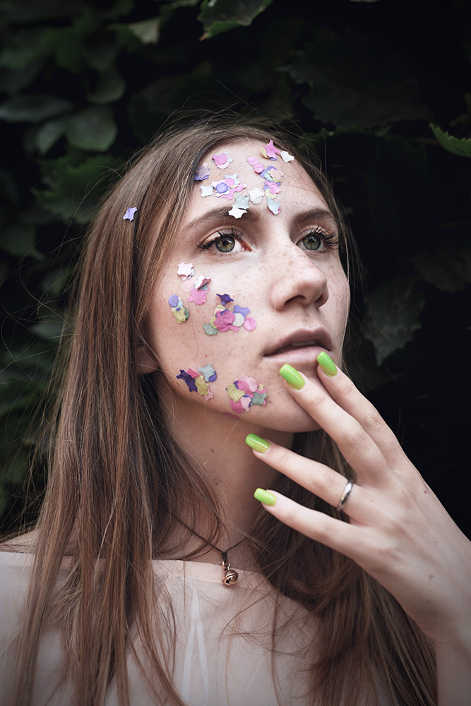 Un' espressione dubbiosa, pensierosa abbinata alla stravaganza dei coriandoli sul viso che però perdono efficacia per via del confronto visivo con il colore, non variegato (come i coriandoli) ma omogeneo e lucido, dello smalto sulle unghie.